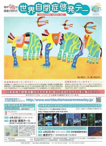~World Autism Awareness in 2015~ 2007年、国連総会において、毎年4月2日を「世界自閉症啓発デー」とすることが決議されました。 日本でも、4月2日から1週間、「発達障害啓発週間」として 日本各地で様々なイベント活動が行われています。 今年のイ…